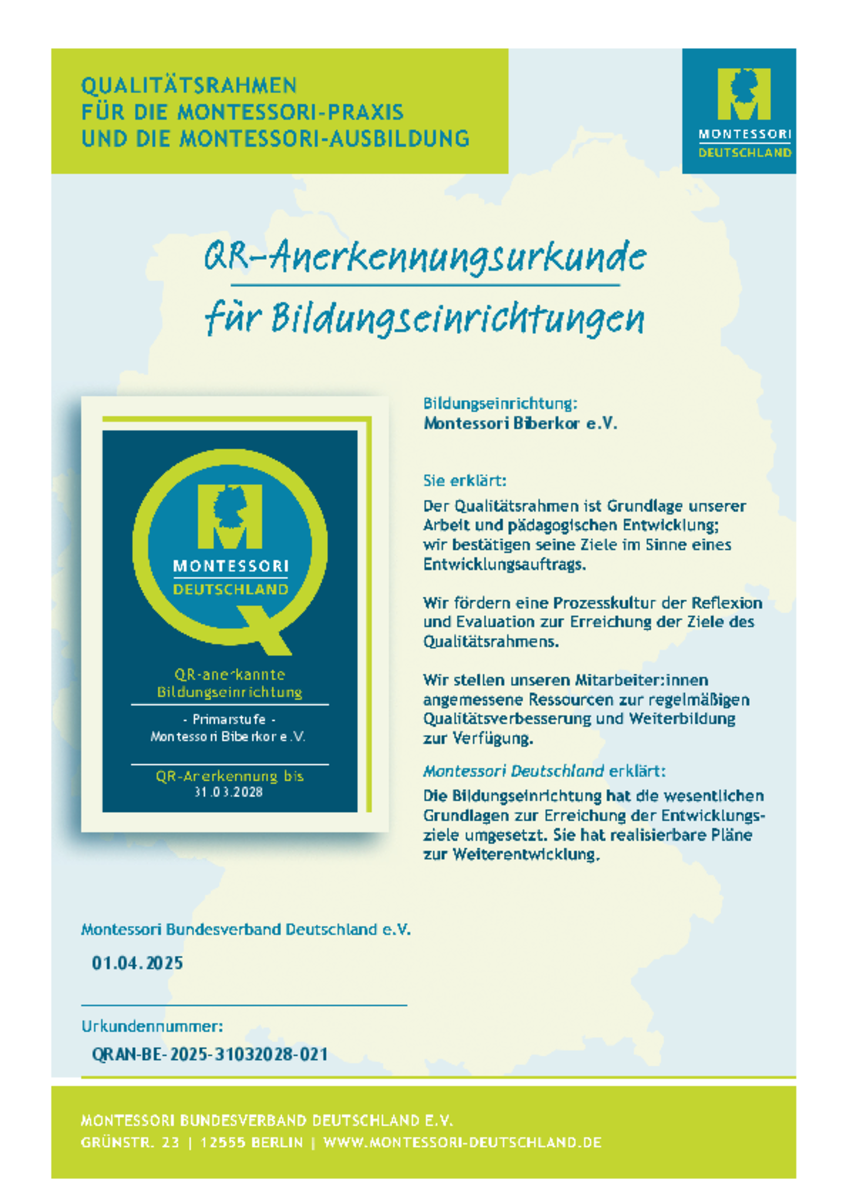 Zu den Aufgaben von Montessori-Deutschland (MD) gehört es, einen Rahmen für die Qualität der Montessori-Praxis und der Montessori-Ausbildung seiner angeschlossenen Organisationen und Bildungseinrichtungen abzustecken.